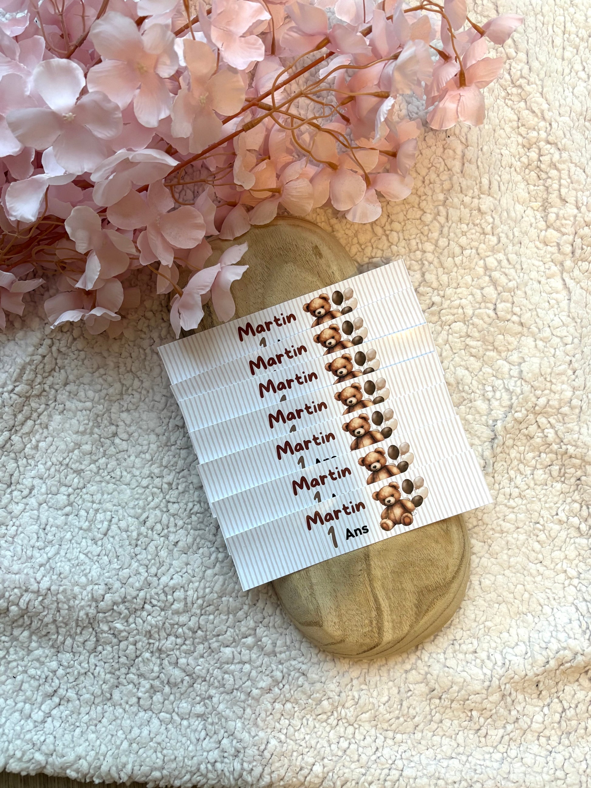 👉 Étiquette “Martin – 1 An” avec un adorable ourson, parfaite pour un premier anniversaire.