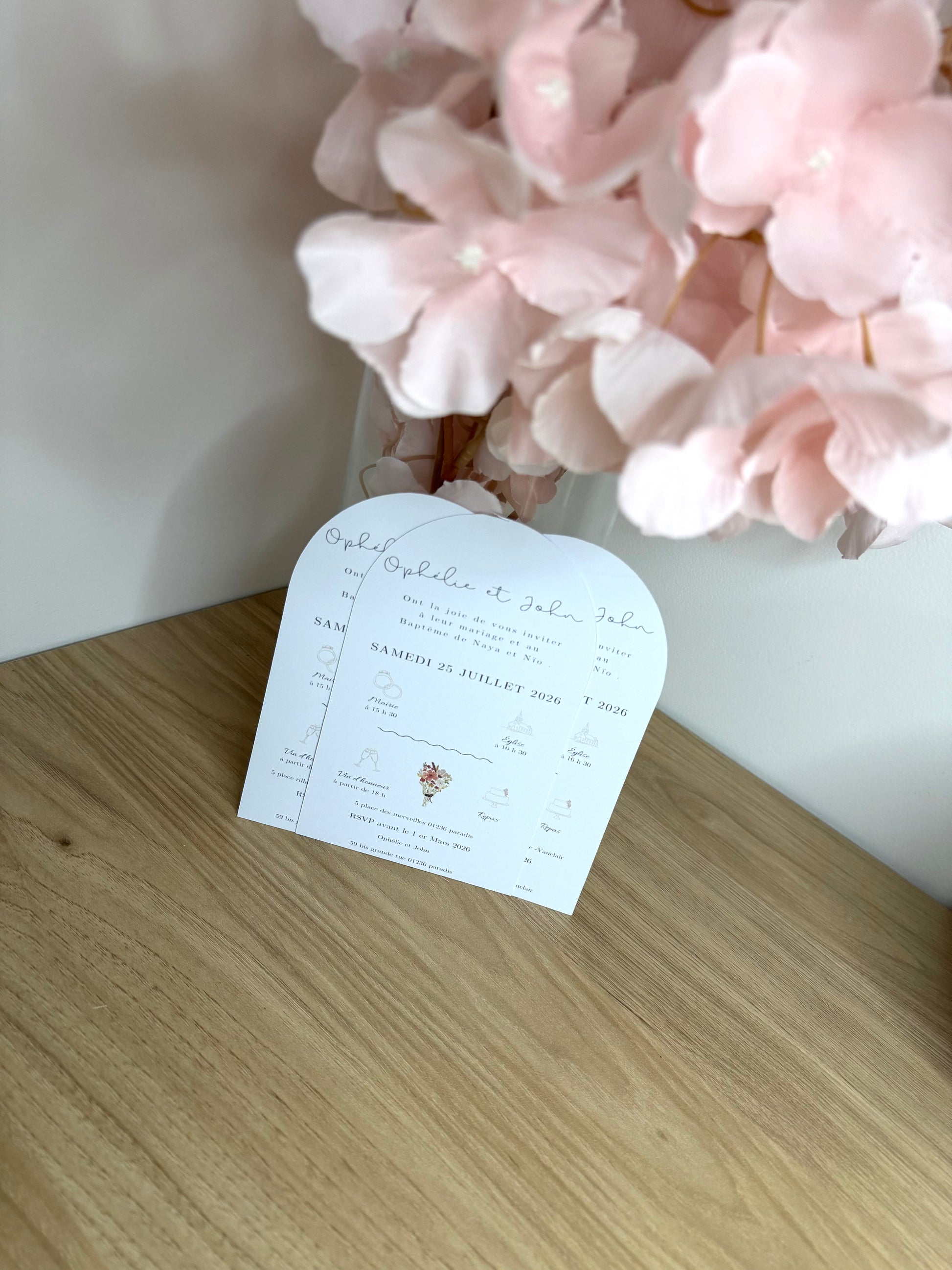 Ce faire-part en forme dâarche et apporte une touche de douceur et dâoriginalitĂ© Ă votre annonce de mariage.