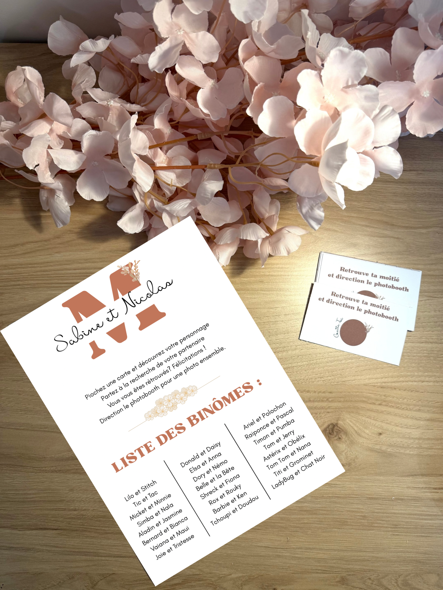 Animez votre mariage de manière élégante et conviviale grâce à ce jeu “Retrouve ton binôme”, parfait pour briser la glace entre invités et créer des moments photo mémorables.