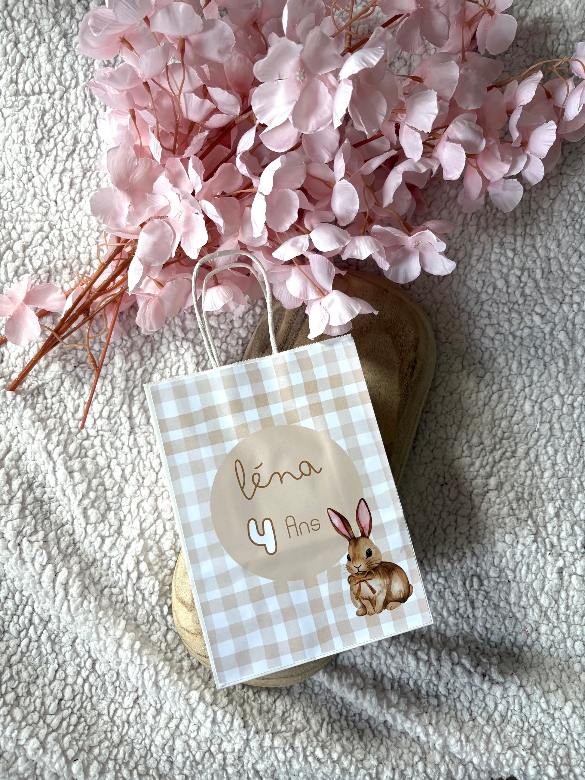 - 🎀ici un Motif à carreaux beige et blanc, orné d’un petit lapin aquarelle.